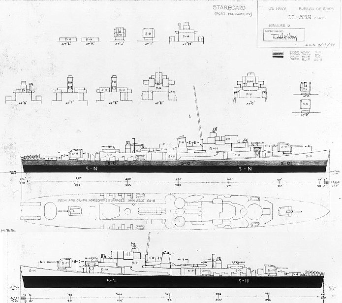This a composite of the two drawings produced for the camouflage experiments dated September 12, 1944. The starboard side was Measure 12, which was an early graded Measure, and the port side was Measure 22. The colors used for Measure 12 were navy blue (5-N), ocean gray (5-O) and haze gray (5-H). Measure 22 colors were navy gray (5-N) and haze gray (5-H). For the camouflage tests these measures were applied to USS Doyle C. Barnes (DE-353).