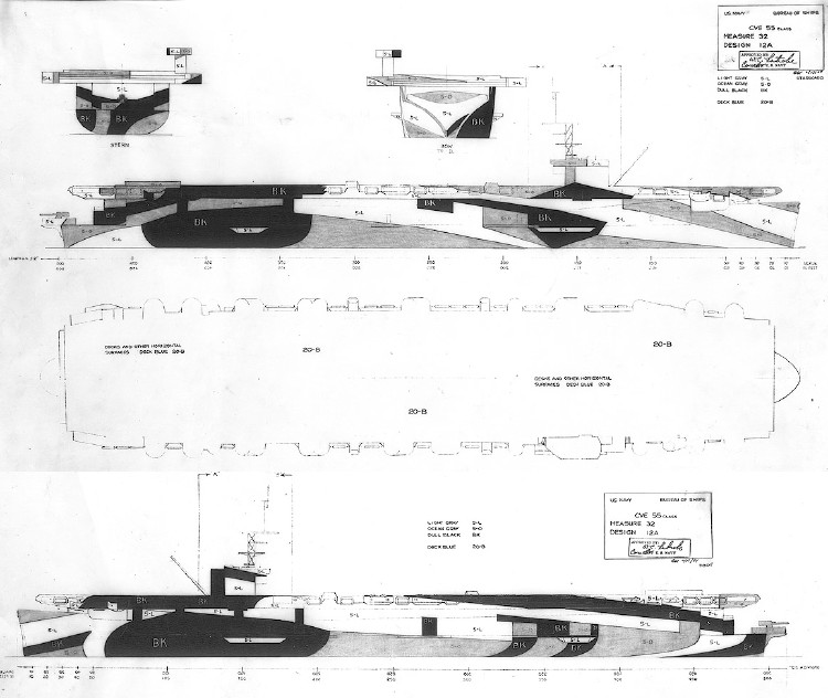 A composite of the drawings for Measure 32 Design 12A for the Casablanca class escort carriers dated February 17, 1944. The vertical colors were listed as dull black (BK), ocean gray (5-O) and light gray (5-L) with the horizontal surfaces deck blue (20-B). The drawing did include both a bow view and a stern view.