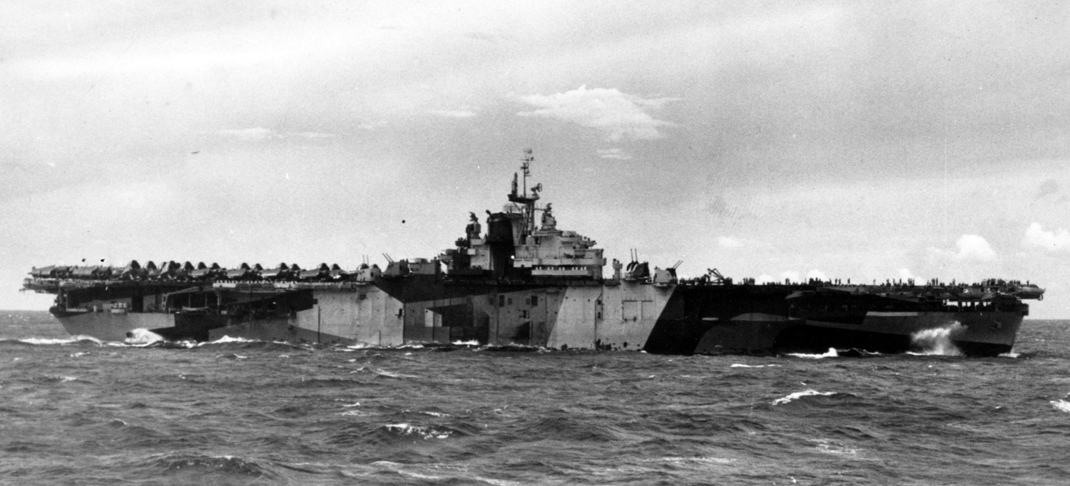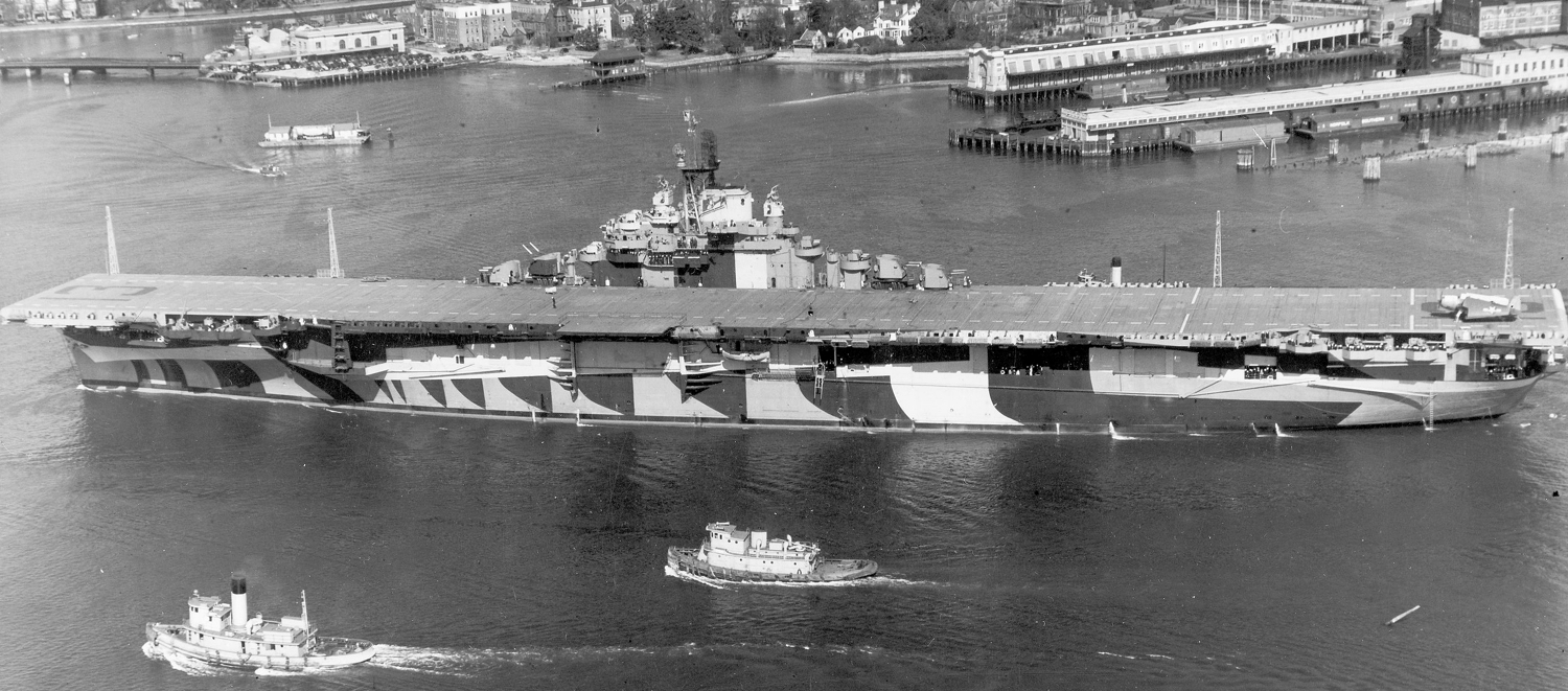 On 12/9/43, CV-13 was sent a camouflage drawing labeled 32/14D, but this was probably a typo or mistake. CV-13 commissioned on January 4, 1944, wearing camouflage design 32/6A on both port and starboard, but three months later repainted the port (the District Camouflage Officer determined Design 6A was too dark on the port) using a modified drawing 32/3A while retaining 32/6A on the starboard side. Severely damaged by bombs 3/19/45 CV-13 did not return to the war.